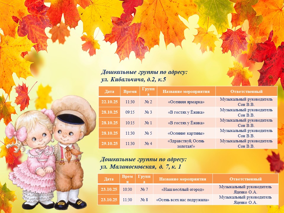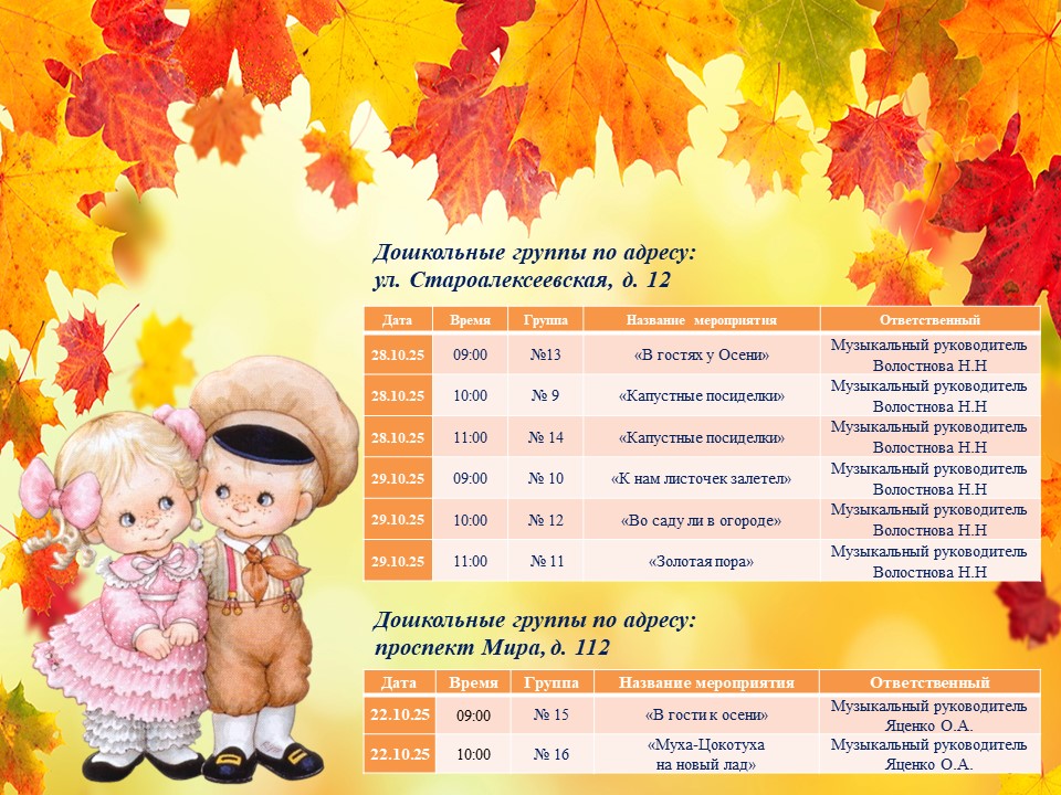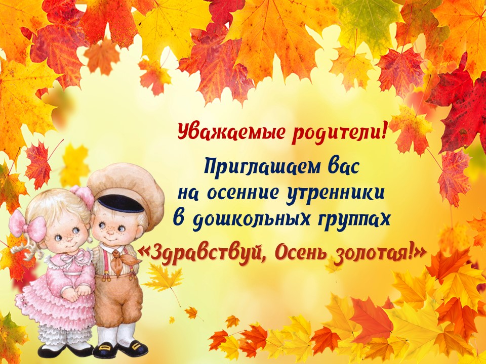 С 22 октября в дошкольных группах начнётся осенняя тематическая неделя «Золотая Осень». Дошкольники встретятся с Царицей Осенью, будут читать стихи об осени, радовать красивыми танцами и песнями. Приглашаем родителей посетить мероприятия и увидеть всю прелесть и красоту осени глазами детей. С расписанием утренников можно ознакомиться ниже.